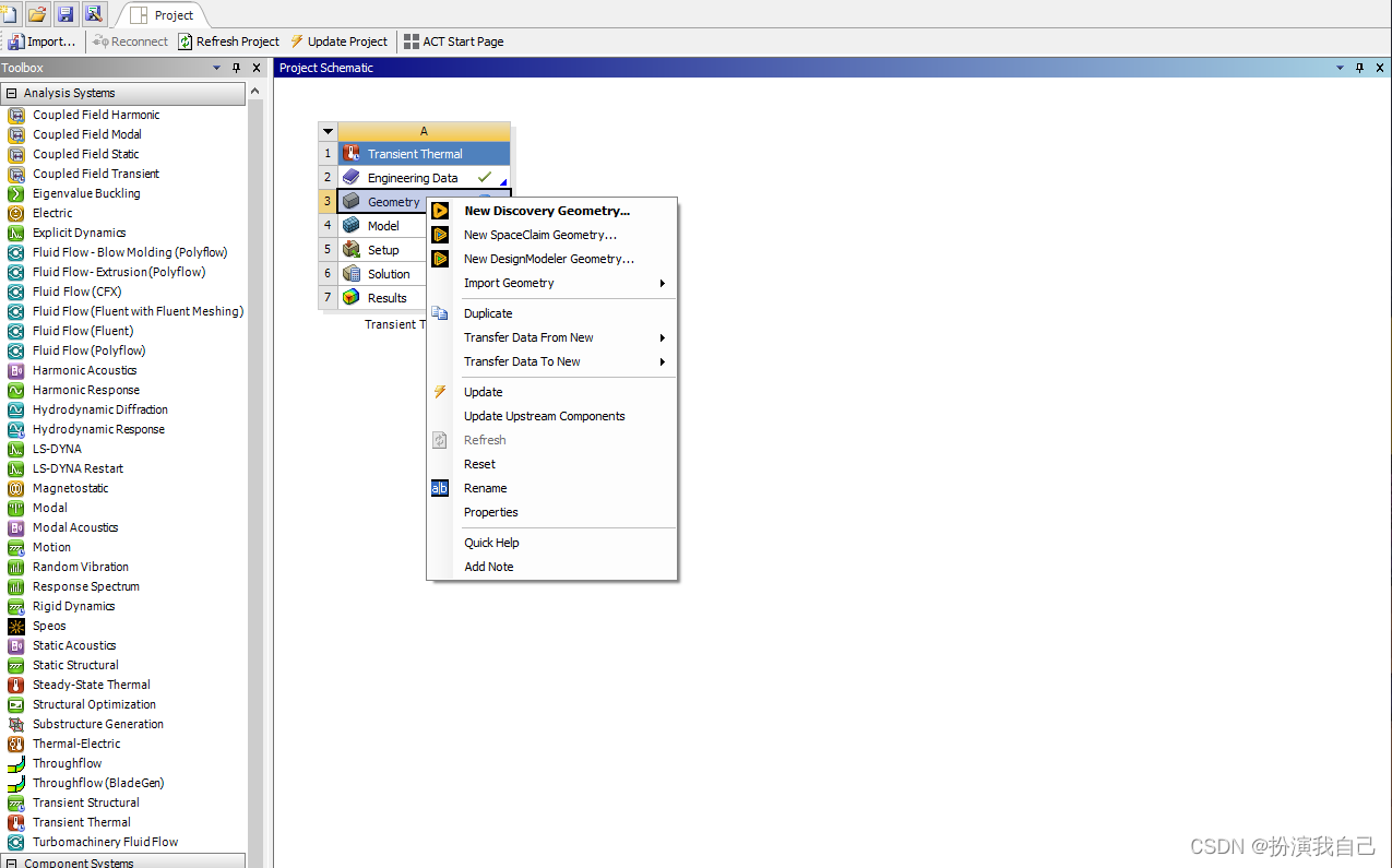 1、打开Workbench,建立一个瞬态热仿真模块,并建立或导入几何模型(切记要记住坐标系的位置);