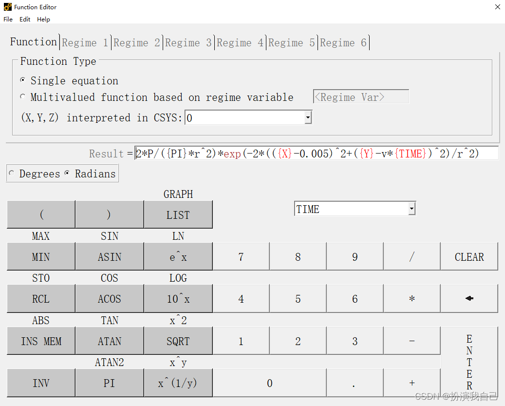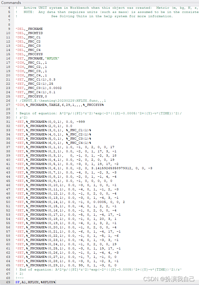 公式中的X、Y表示的是加载的位置,要与几何体建模中的默认坐标系对应,输入时公式中的X、Y、TIME参数都要在下面的小方框中选,输入后点击File-Save,保存刚刚输入的函数文件,文件名为HFLUX;(这里可以在公式前方输入一个参数a来定义工件材料对激光的吸收率)