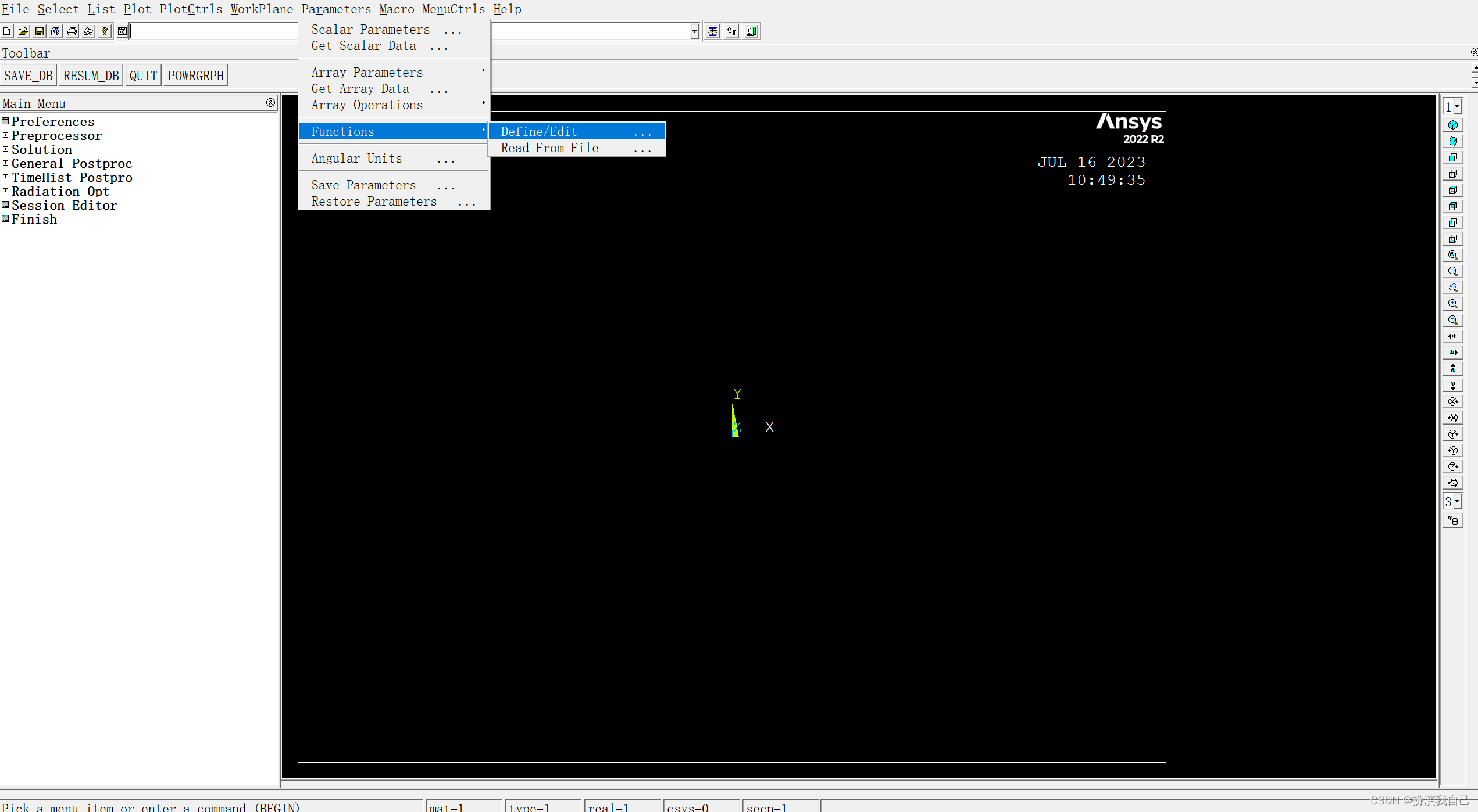 2、 在Workbench中保存项目,关闭workbench,打开Mechanical APDL(下文均称APDL),在上方菜单栏中选择Parameters-Functions-Define/Edit,进入 公式 编辑页面;