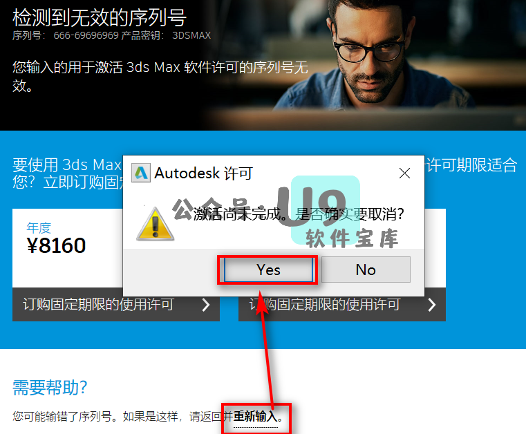 点击“重新输入”,在弹出框内点击“Yes”。