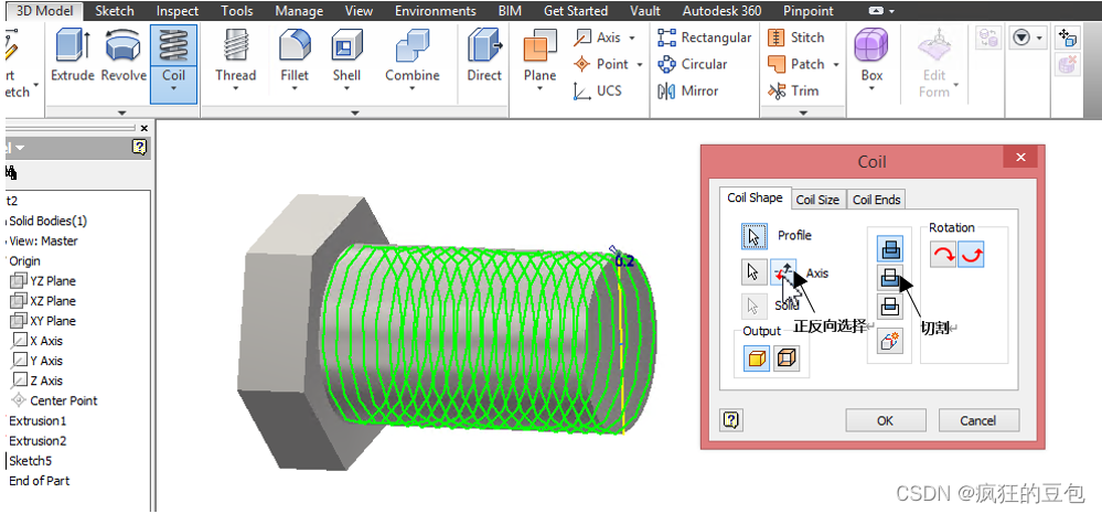 点击“三维模型”功能栏中的“螺旋扫掠”工具,选择图形和轴,注意选择正反向,同时选择切割模式,点击Ok即可。