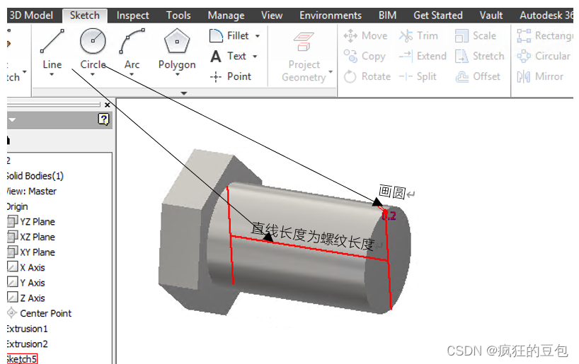 若要创建螺纹,首先创建一个圆柱体、工作平面和工作轴来定位螺纹截面轮廓,然后创建和定位用于螺纹的轮廓,最后切割螺纹。