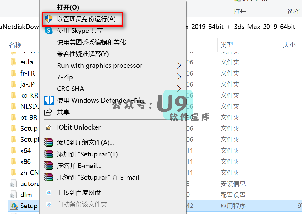 将下载的压缩包解压开,进入3ds_Max_2019_64bit 文件夹 ,然后右键以管理员身份运行“Setup”应用程序。