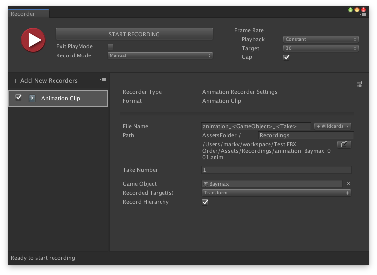 您可以使用Unity Recorder的动画剪辑支持将游戏玩法录制到资产中。