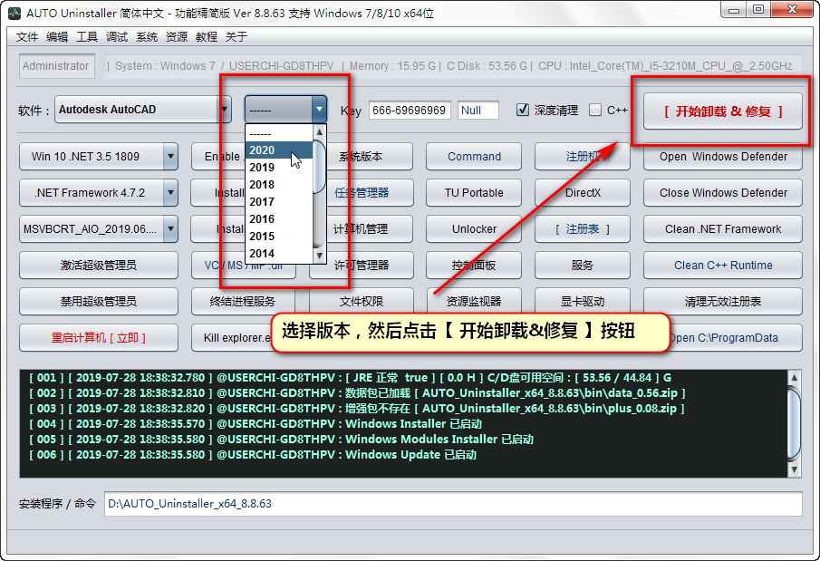 5、选择版本、点击 [ 开始卸载 & 修复 ] 按钮
