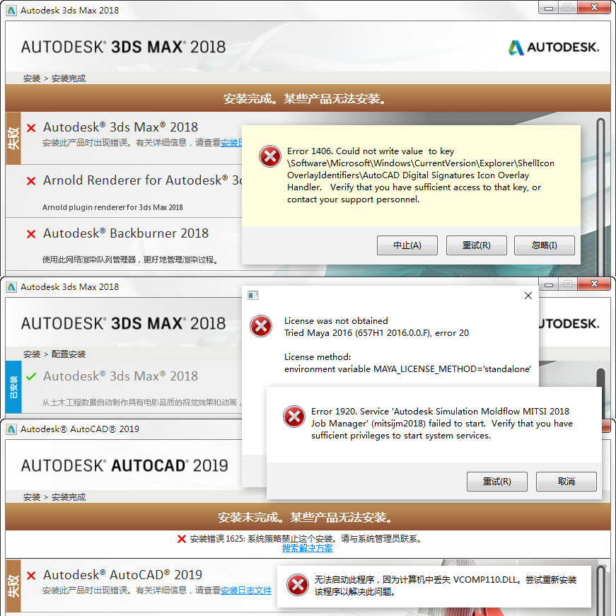 小伙伴是不是遇到 CAD/3dmax/maya/Revit/Inventor 安装失败或者安装不了的问题了呢?AUTODESK系列软件着实令人头疼,CAD/3dmax/maya/Revit/Inventor安装失败之后不能完全卸载!!!(比如maya,cad,3dsmax,inventor,revit等)。有时手动删除注册表重装之后还是会出现各种问题,每个版本的C++Runtime和.NET framework也是不同的,OMG!看了网上各种办法,都没有有效的解决方法。下面介绍如何借助一个工具完全卸载删除修复几千条注册表,然后重装CAD/3dmax/maya/Revit/Inventor就OK了,另外还可以修复系统缺失或者损坏的组件,比如C++各种,.NET问题,显卡驱动问题,许可证问题。本工具不是用C++编写的,所以能做到无视和免疫C++版本问题带来的各种错误!