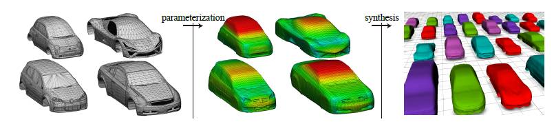 在本文中,我们提出了一种新的参数化技术,该方法可以有效地将给定的非结构化网格转换为使用深度信息的具有一致连通性的流形网格。我们的参数化方法对于诸如孔、间隙和倒三角形之类的缺陷是具有非常稳健的鲁棒性的。我们通过将形状表示为一个强场(hight field),从而实现了对一个3D形状的紧凑和明确的参数化,它是从一个简单的原始多边形的细分中得以提升的。我们通过对超过1000个汽车形状进行参数化从而来证明我们方法具有稳健的鲁棒性。