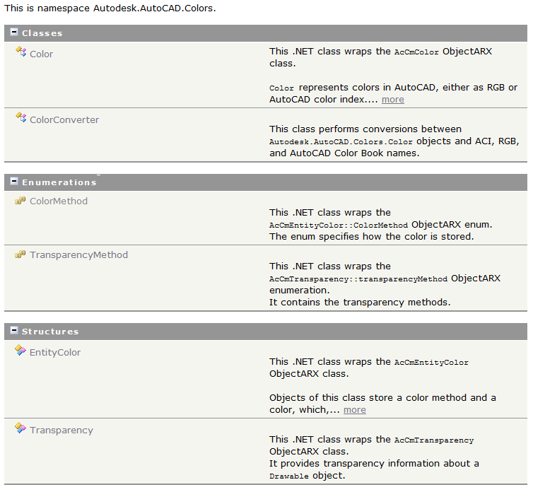 两个类(Color, ColorConverter),两个枚举类型(ColorMethod, TransparencyMethod),两种结构体(EntityColor, Transparency)。