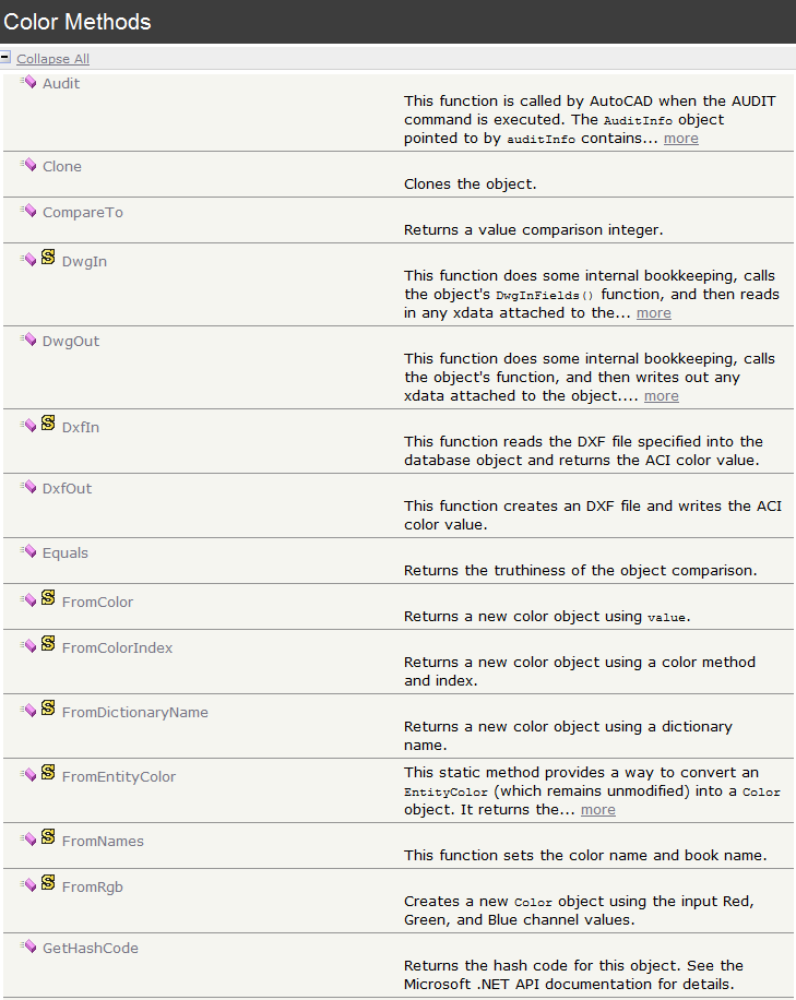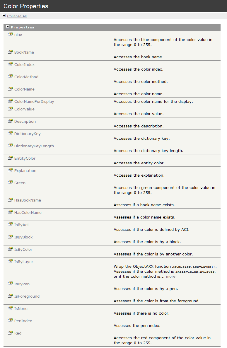 通过上述表格,可以看出,Autodesk.AutoCAD.Colors Namespace命名空间中包括了