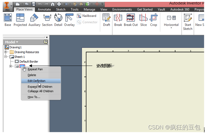 正如前文介绍的,打开任一Inventor工程图纸模板,均会出现如下图箭头指示的图框名称,鼠标右键点击,同时鼠标左键点击“编辑定义”,就可以更改图框。