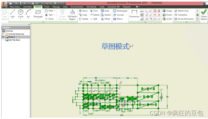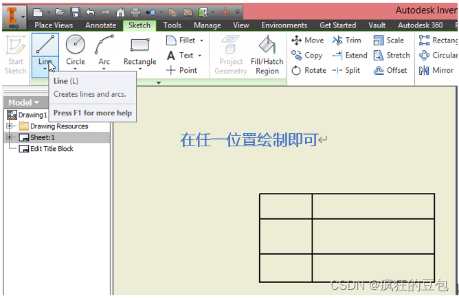 使用“直线”工具开始绘制表格,在任一位置作图均可,Inventor会自动将表格放置右下角对齐。