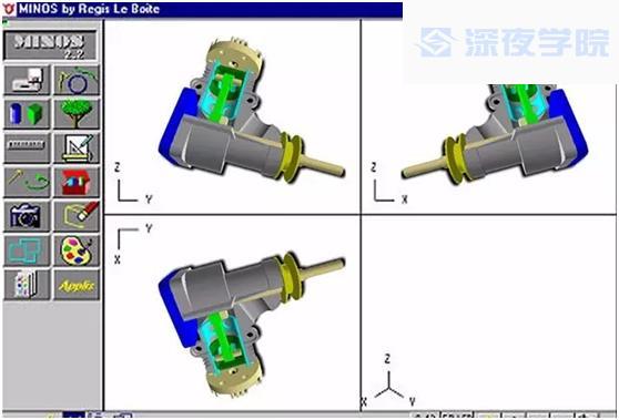 Minos的程序很小,但是功能完善。包括了消除隐藏线、多种实体制作、涂色、调色、阴影渲染等功能。设计时,Minos将简单的几何元素连接在一起,最终形成轮廓。