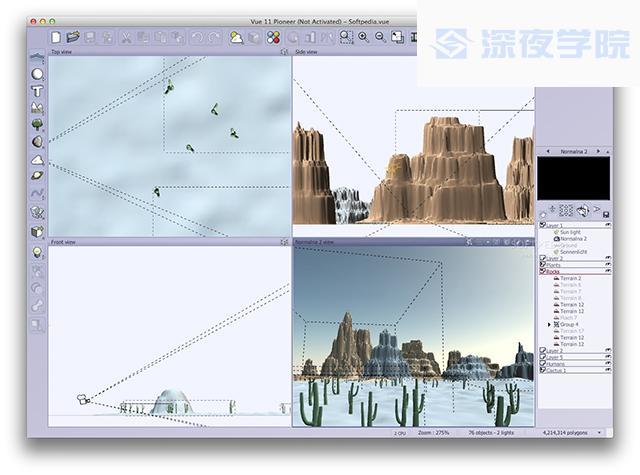 此款软件为建模、动画、渲染等3D自然环境设计提供最高级的解决方案。目前全球很多大型电影公司、游戏公司或与景观设计相关的公司都用此软件进行3D自然景观开发。它的涵盖范围包括面向CG专业人员的Vue Infinite和Vue 9×Stream, 面向3D艺术家的Vue 9 Esprit、Vue 9 Studio和Vue 9 Complete,以及面向爱好者的Vue 9 Pioneer, 主题包和Vue 9 Frontier。
