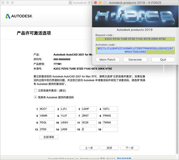 14、进入Crack文件下,双击加载xf-adesk19.dmg,并运行其中的 注册 机,点击注册机当中的Mem Pacth,之后复制软件中的申请码到Request code当中,然后点击generate生成注册码,最后将注册码复制到软件当中进行注册;