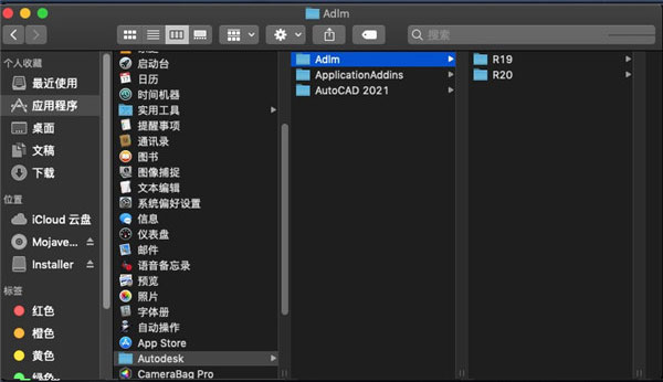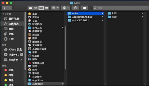 6、进入应用程序/Autodesk/adlm目录下看到R15和R20两个文件夹,将R20文件夹重命名为R19,R15文件夹重命名为R20;