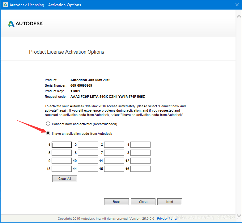 3.重新打开软件后,再次点击Activate激活,出现下界面,选中“I have an activation code from Autodesk”;