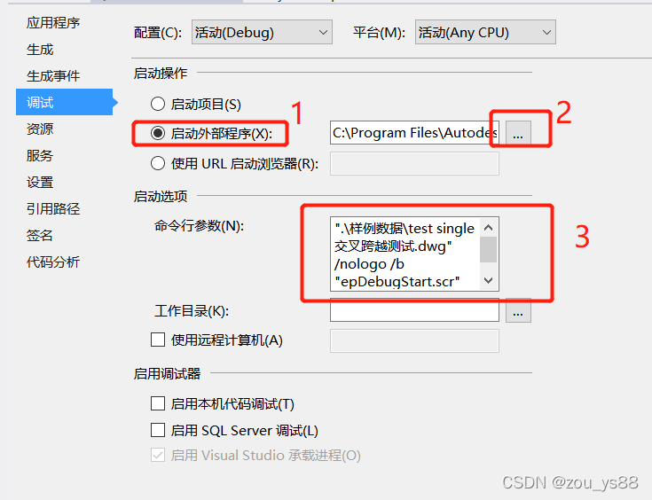 2.1启动外部程序,选择电脑中安装的AutoCAD安装目录下的acad.exe文件。点击图中的2位置的按钮可以打开对话框直接选择acad.exe文件。比如: