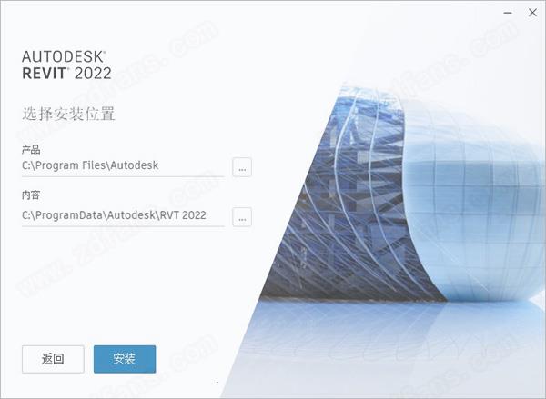 4.选择安装位置,默认产品路径为“C:\Program Files\Autodesk”,默认软件内容路径为:C:\Program Data \Autodesk\RVT 2022;建议最好不要安装到系统盘(C盘)
