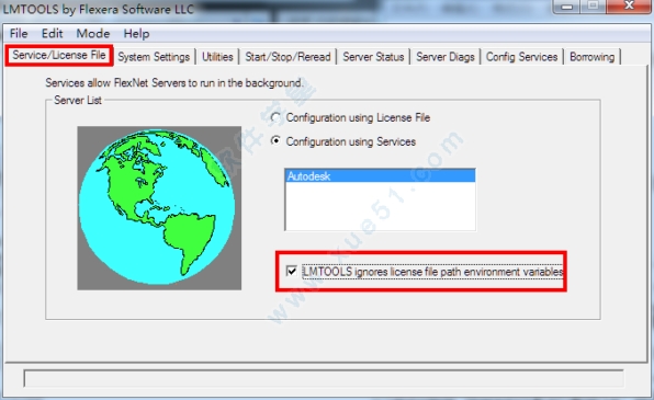 8、然后点击service/license file选项,勾选 'LMTOOLS ignore license file path env variables";