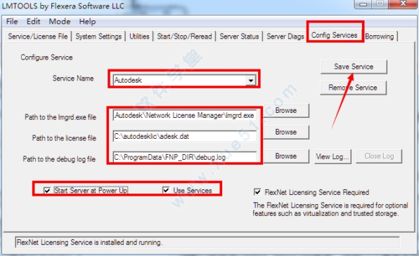 勾选'start server at power up' 和 'use services',点击 Save Service