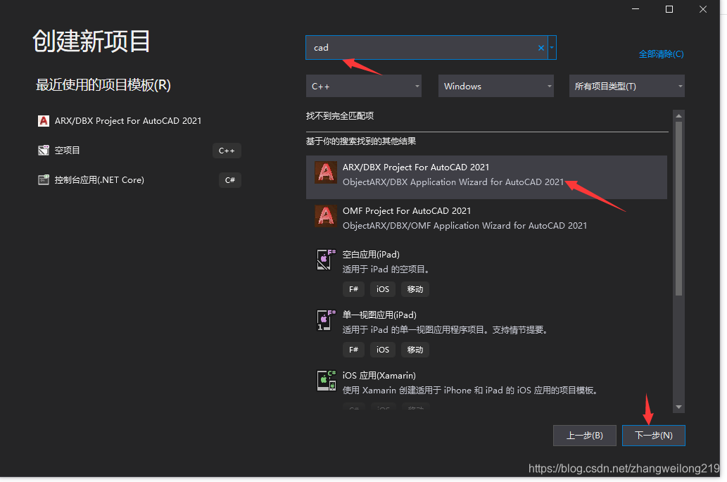 打开vs2019创建工程,在搜索栏中输入cad字样,就会出现