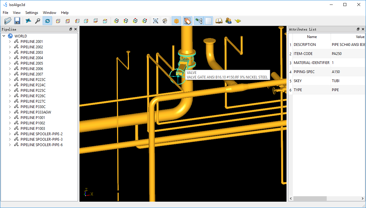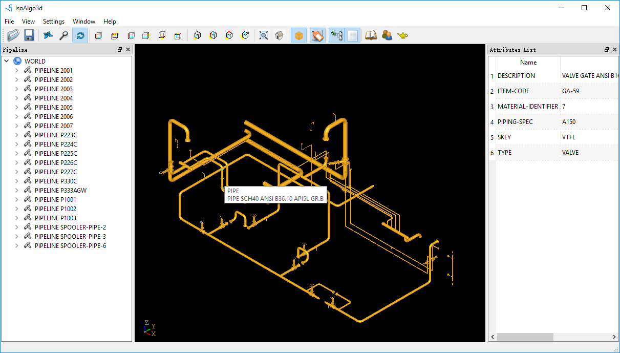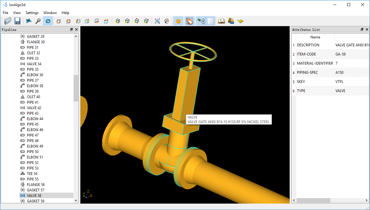 IsoAlgo3d为自主开发,独有的软件运行平台。可方便地导入IDF(ISOGEN Data File,来自Intergraph PDS and AVEVA PDMS)、PCF(Piping Component File,来自Intergraph SmartPlant 3D等使用ISOGEN的设计软件),实现与设计院/工程设计公司的设计数据无缝对接。导入管道IDF/PCF文件后,可以方便地查看三维模型,并且通过点击相应管件的三维模型,在属性窗口中会显示出管件相关的信息,如管道等级、管件类型、材料代号、材料描述等。