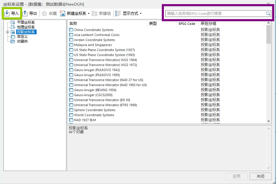 首先需要与模型制作方确认该模型实际建模坐标系,如果能获取到含坐标系信息xml文件是最好的,如果没有该xml坐标文件也需要确认该模型EPSG码为多少。单击上图中红框圈出部分进行重新指定坐标系。如果下拉菜单中包含使用坐标系可以直接设置,如果不包含可以选择更多弹出坐标系设置窗口。如果已有xml文件的话,使用绿色框中导入可以导入已有坐标系。如果已知epsg码的话,可以使用紫色框内部去搜索坐标系进行设置。