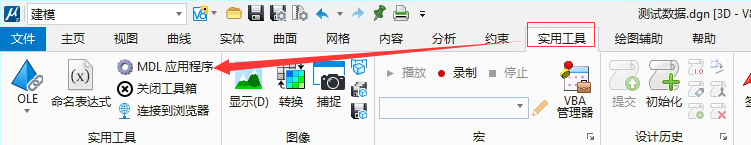 由于bentley产品可能会出现识别不到插件的情况,导致内容菜单栏中并未显示插件内容。可以通过如下方法运行该插件。菜单栏选中实用工具,在实用工具选框中可以找到MDL应用程序。