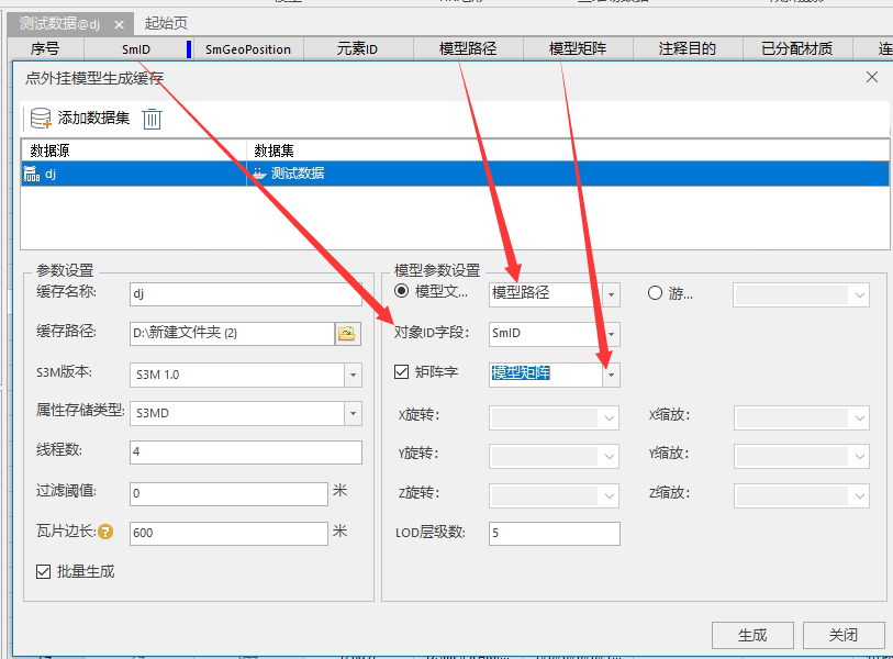 左半边参数设置为常规设置,根据实际使用需求进行设置,或者默认使用即可。右边模型参数设置则需要根据三维点数据集中的字段进行选择。导出数据已包含这些字段可以直接选择。配置完成后选择生成,在输出目录中即可看到输出的文件了。