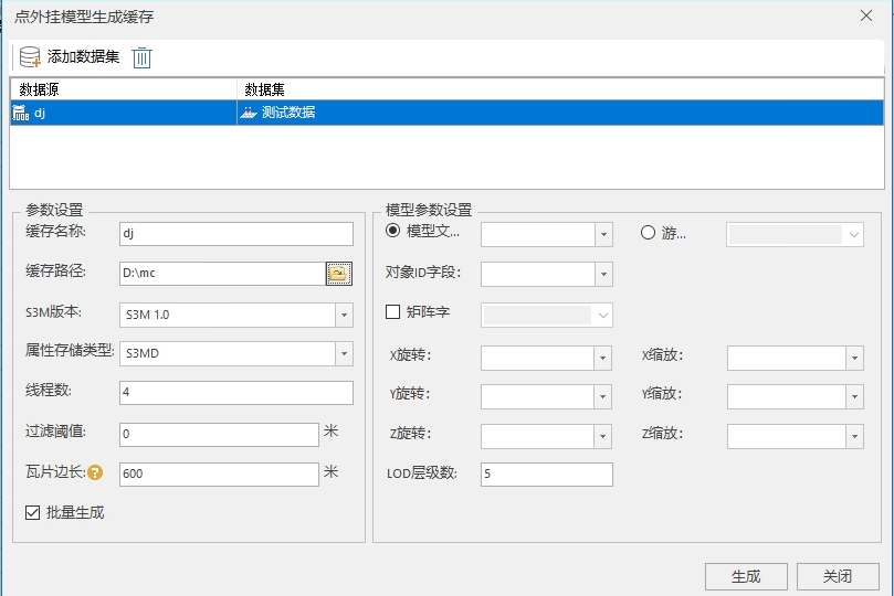 菜单栏中【三维数据】三维瓦片选框中【生成缓存】下拉框,选择【点集生成外挂缓存】弹出如下窗口。