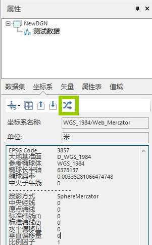 由于需要将模型放置到球面场景使用,这里需要对模型原始投影坐标系转换至地理坐标系,使用投影转换功能将坐标系进行转换操作。可以在属性中直接进行操作,或者在开始菜单栏中数据处理投影转换操作下拉框选择数据集投影转换进行操作。