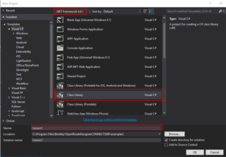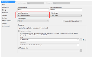 在VS2015的项目创建模板中选取:Templates->Visual C#->Class Library。项目名称设置为“Lesson1”,.Net Framework 选择4.6.1(如果创建项目时没有设置.net框架的版本,可在下图所示的项目配置中设置),路径设置在ORD SDK安装目录(笔者的安装目录为:C:\Program Files\Bentley\OpenRoadsDesignerCONNECTSDK\)下的examples文件夹中。