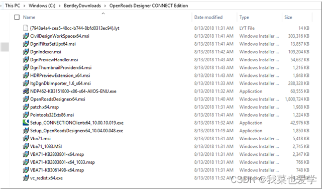 ⑶、查看C:\BentleyDownloads\OpenRoads Designer CONNECT Edition文件夹下的文件,如下图所示。