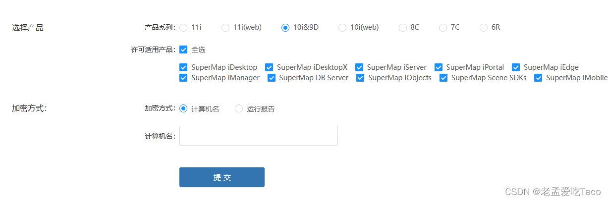 Bentley使用的是SuperMap Bin C++组件包。所以需要配置组件许可。第一步在官网中申请试用许可,选为全许可的试用许可即可。下载的bin包中使用的10i版本的许可,在申请的时候也需要注意一下。不要选成11版本的了。
