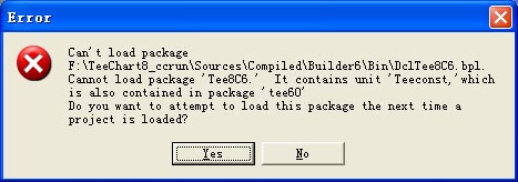 4. 启动BCB6,这时我们可能遇到问题啦。如下图所示出现的提示:Cannot load package "Tee8C6.", It contains unit "Teeconst," which is also contained in package "tee60"。这里不要管它,所有提示选择“YES”,这是因为与BCB里面安装的低版本TeeChart发生冲突。