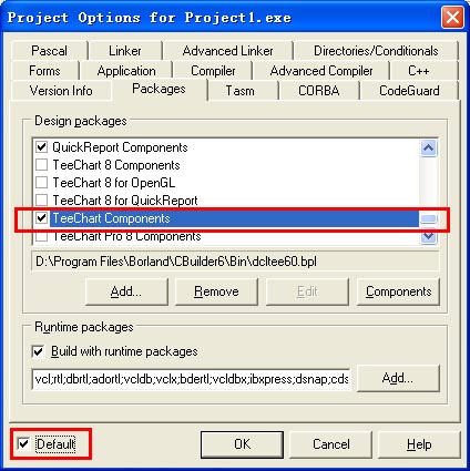 5.当BCB6启动完成后,点击菜单 Project ->Option,选择Packages栏目,在Design Packages下面找到TeeChart Components。将下面的Default选择栏打上勾,然后点击“Remove”按钮。