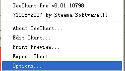 9.是否觉得看英文不习惯呢,怎么TeeChart8有 中文 版,不错。按下面的步聚做吧。选择“Chart”控件放在Form上,然后在Chart的控件下点击鼠标右键,出现下面的菜单。选择“Options”