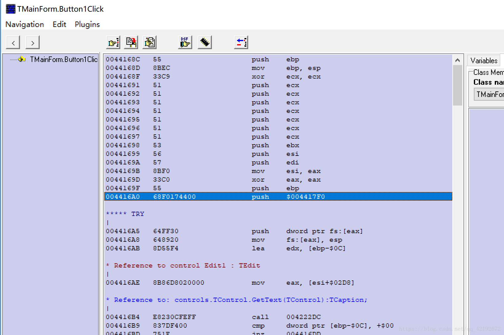 我们一共看到了两处Button1Click,第一处是地址表中的调用,第二处是资源本身,我们显然是要找第一处