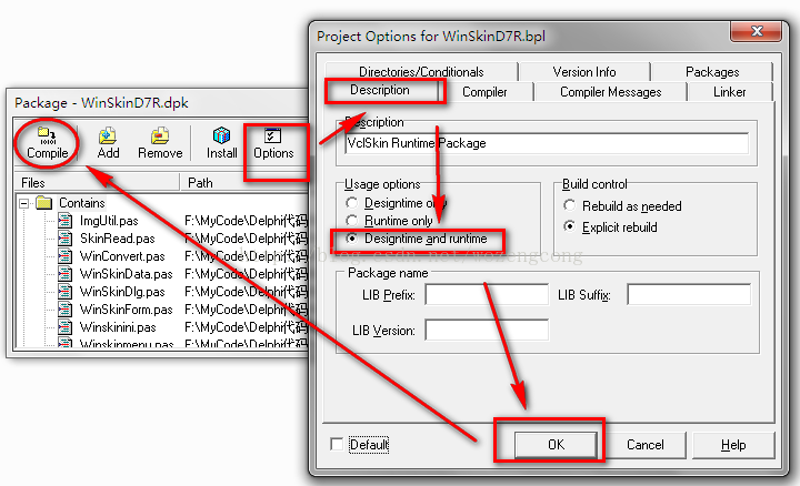 然后,在Package对话框点击Options,在Description选项卡→Usage Options,选中Designtime and runtime ,再点击OK确定按钮,再点击Compile自动完成就可以了。