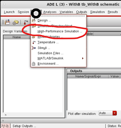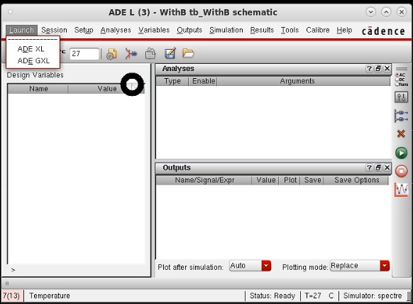 schematic视图左上角 launch 启动各种仿真器,ADE L界面左上角Launch 启动ADL XL 和ADE GXL。通过ADE L启动的ADEXL 会继承ADE L的各种设置,如变量、plot and save的点等等。