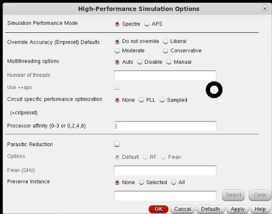 3.高性能仿真:电路规模比较大的话,用 APS 仿真,启动多核跑,加快仿真。一般点一下APS就行,想知道各个选项具体什么含义,点Help。(各种界面善用Help)