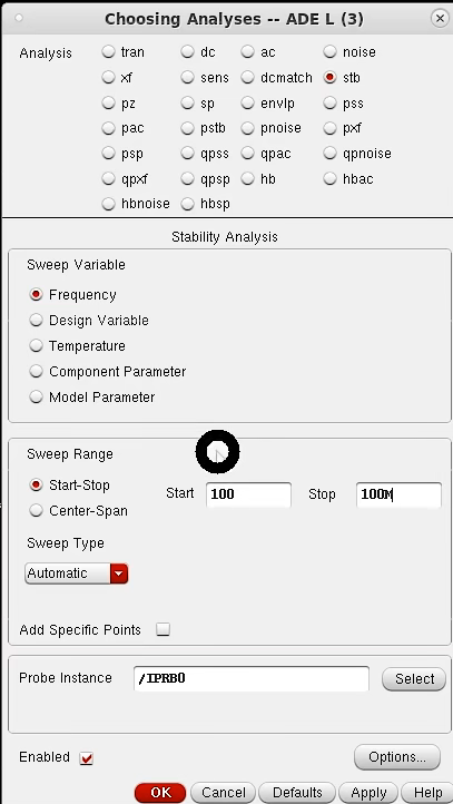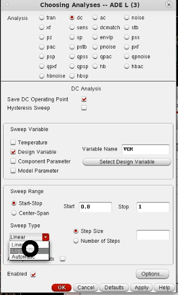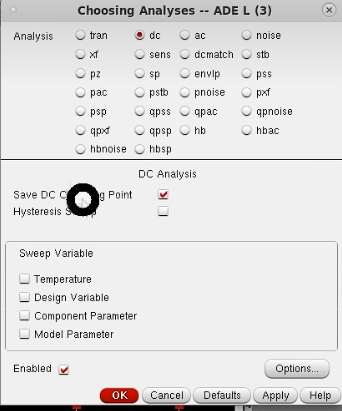 仿真设置:记得勾选保存直流工作点Save DC OP(后续Calculator中OP就是DC下各种参数)。DC仿真可以进行变量扫描 Sweep Variable。