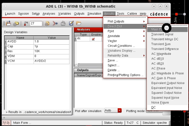 查看扫描波形:Results - Direct Plot - Main From(这个是后期最主要的查看波形方法)或者schematic 界面上方 直接能查看Direct Plot