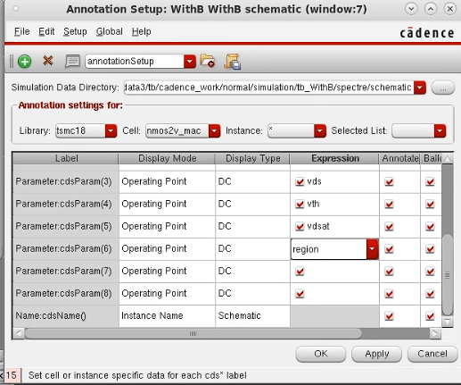 其中library为工艺库,Cell为需要显示的管子,Instance 为具体的例化名称。Expression中可以更改想要显示的参数。