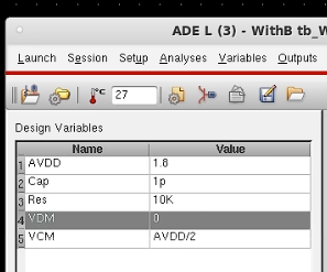 4.器件参数变量化设置: 这个很简单,说一下就是,器件的参数可以是另一个变量,比如下面VCM 是 AVDD/2,其中VCM和AVDD都是变量。