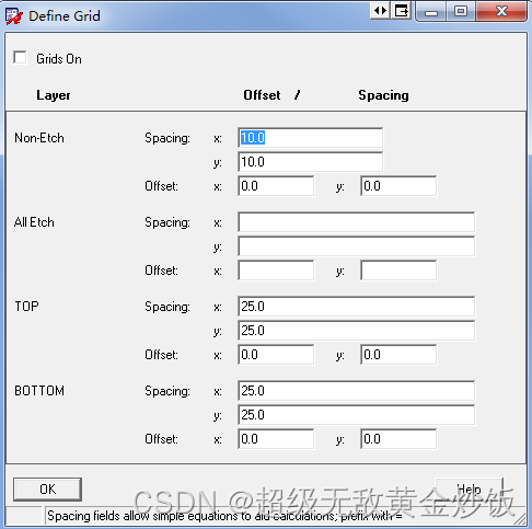 注意:此处分为电气栅格和非电气栅格,如第一行中的non-etch,就包括了板卡外框等内容,后面的etch层,则是包含了所有的常规走线等内容。