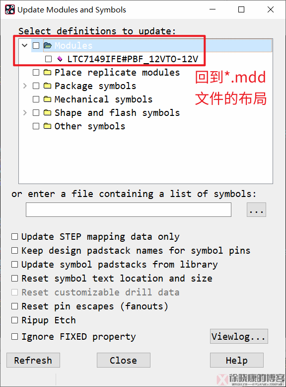2)做好的模块文件用在 pcb 中后,若需要修改这部分文件,可以打开对应的mdd文件,然后在原 pcb 中使用 update symbol 功能,选相应的 moddle进行更新。当然,你也可以直接修改复用PCB模块的单个器件,不过这时你如果update modules,布局又会回到mdd的布局了。