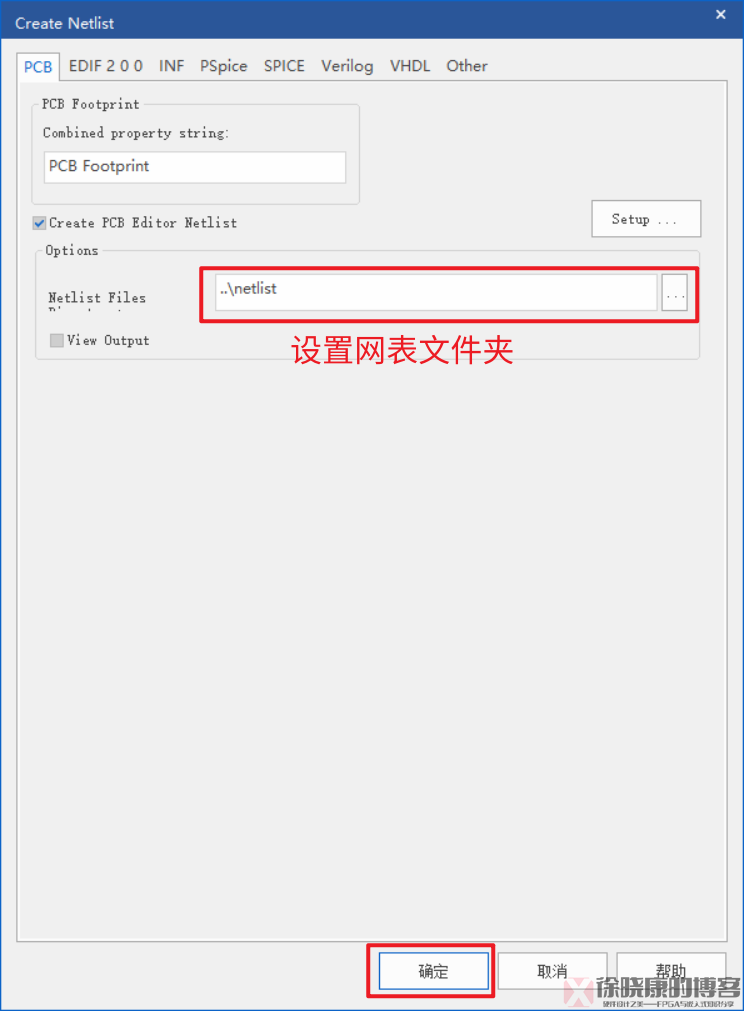 Tools -> Create Netlist…,打开创建网表窗口,导出网表。