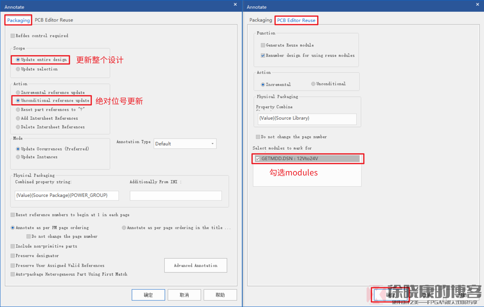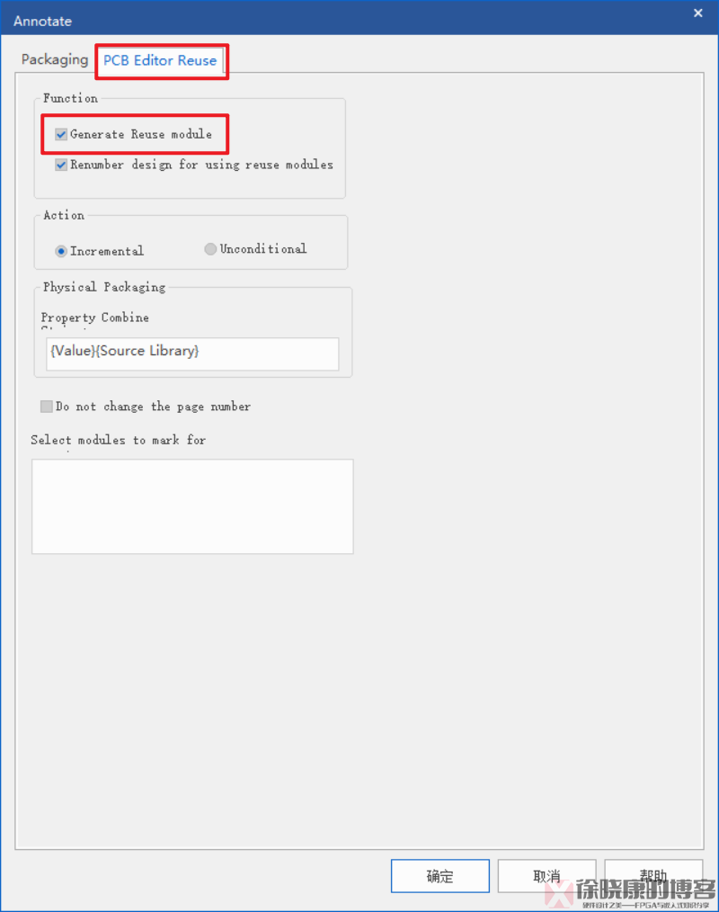 在Annotate窗口的PCB Editor标签页中,勾选Generate Reuse module(生成复用模块),点击确定。