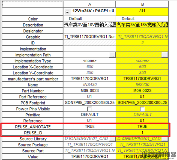 按Ctrl + S保存设计,然后选择任意器件,右击 -> Edit Property,查看其属性。如下图,可以发现,当前属性增加了两项:REUSE_ANNOTATE 和 REUSE_ID。这两个属性就是原理图与PCB间器件一一对应的纽带。